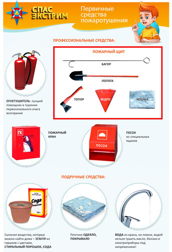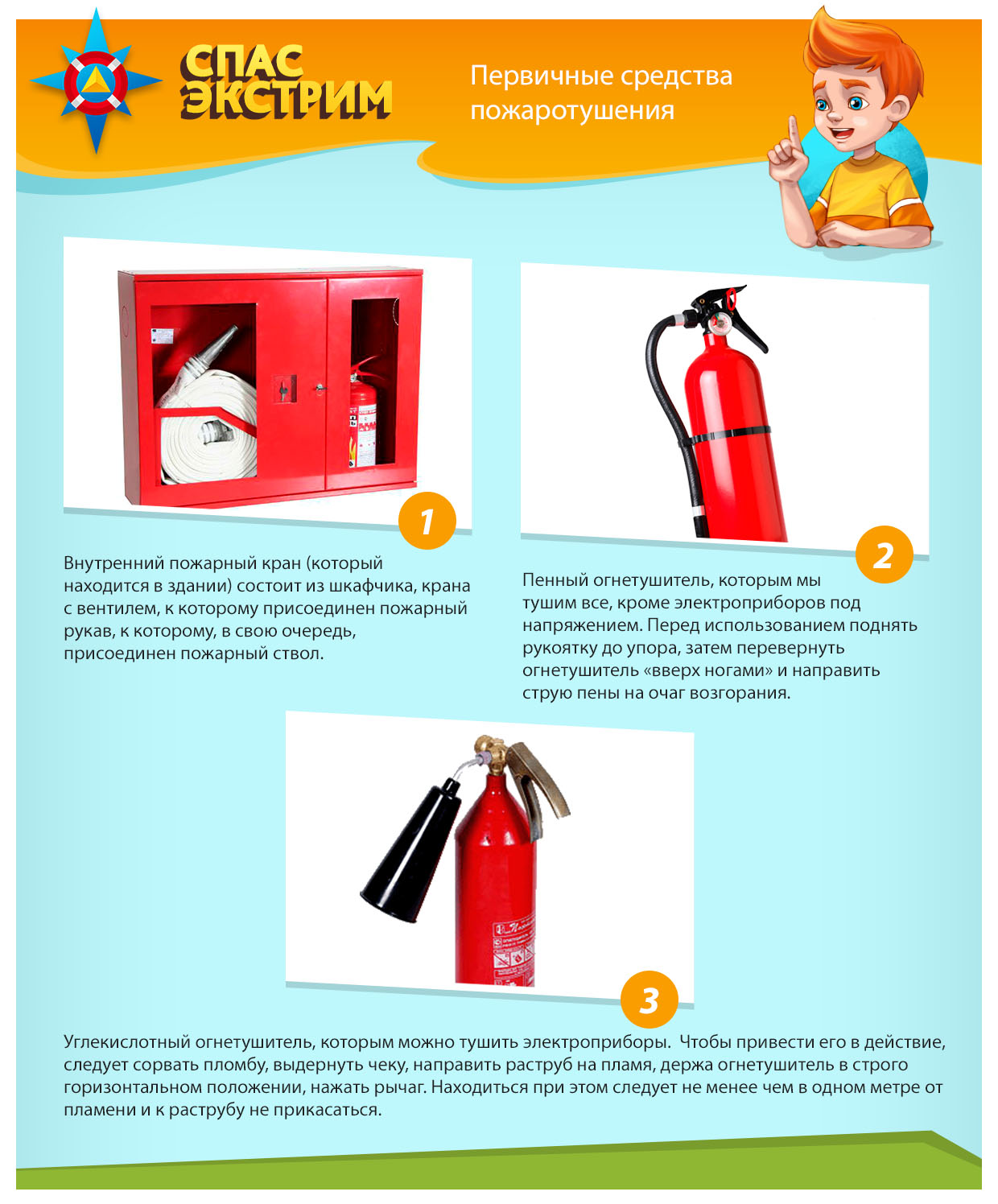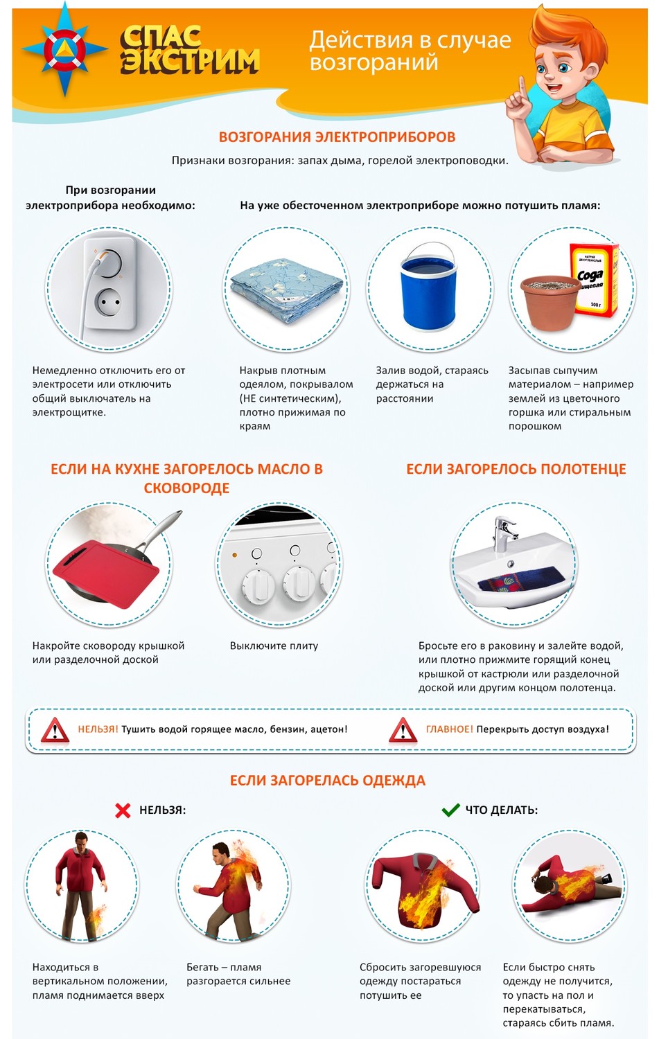 Действия в случае возгораний Очень важно запомнить, какие именно способы подходят для тушения тех или иных предметов, так ты сможешь быстрее сориентироваться, если окажешься в сложной ситуации. Например, если горящую мусорную корзину можно легко потушить водой, то включенный электроприбор ни в коем случае заливать водой нельзя, может произойти короткое замыкание. А горящую на человеке одежду лучше тушить, катая пострадавшего по земле – это уменьшит доступ кислорода, и огонь погаснет.
