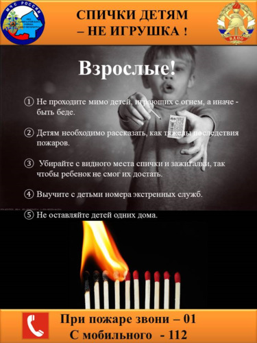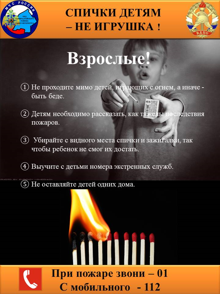 Как уберечь детей от пожара Проблема детской шалости с огнем актуальна всегда. И для её решения требуются общие скоординированные и целенаправленные действия родителей, воспитателей и учителей. Профилактика детской шалости с огнем в семье обычно сводится к банальным запретам. Но запретный плод сладок: дети ищут новых ярких впечатлений, балуются со спичками и огнеопасными предметами. Зачастую это заканчивается трагедией. Поэтому Отдел надзорной деятельности и профилактической работы Адмиралтейского района обращается к родителям, воспитателям и преподавателям! Чтобы не было беды, мы все должны строго следить за тем, чтобы дети не брали в руки спички. Нельзя допускать, чтобы дети пользовались электронагревательными приборами. Если у вас есть малолетние дети, ни в коем случае не оставляйте их дома одних тем более, если топится печь, работает телевизор или другие электроприборы. Не показывайте детям дурной пример: не курите при них, не бросайте окурки куда попало, не зажигайте бумагу для освещения темных помещений. Храните спички в местах недоступных для детей. Ни в коем случае нельзя держать в доме неисправные или самодельные электрические приборы. Пользоваться можно только исправными приборами, имеющими сертификат соответствия требованиям безопасности, с встроенным устройством автоматического отключения прибора от источника электрического питания. Помните - маленькая неосторожность может привести к большой беде. Трагические случаи наглядно доказывают: главная причина гибели детей на пожаре кроется в их неумении действовать в критических ситуациях. Во время пожара у маленьких детей срабатывает подсознательный инстинкт: ребенок старается к чему-то прижаться, куда-то спрятаться, ищет мнимое убежище - под кроватью, столом и т. д. Там его беда и настигает. Поэтому обязательно научите ребенка действиям при пожаре, покажите ему возможные выходы для эвакуации. Очень важно научить ребенка не паниковать и не прятаться в случае пожара. Дома - родители, в детских садах - воспитатели, а в школах - преподаватели, все мы обязаны обеспечить неукоснительное выполнение детьми правил пожарной безопасности, строго противопожарный режим, немедленно устранять причины, которые могут привести к трагедии. Чувство опасности, исходящее от огня, ребенку нужно прививать с раннего детства. Соблюдение правил безопасности должно войти у каждого в привычку. Научите ребенка в случае возникновения пожара незамедлительно вызывать пожарную охрану. Для этого необходимо набрать номер «01» (с мобильного телефона – 112 или 101). Информацию предоставил: ОНДПР Адмиралтейского района
